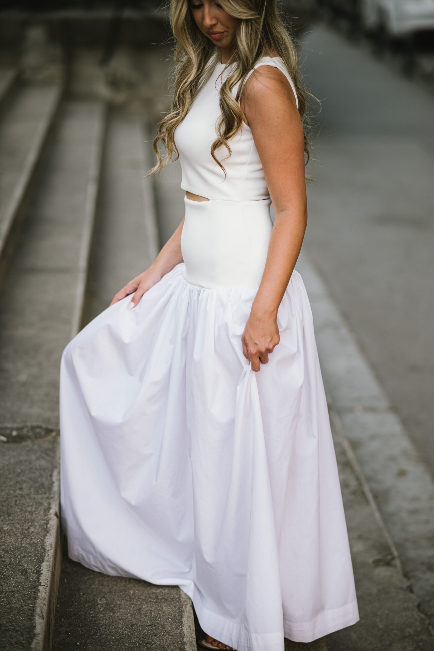 Gornji deo je krojen uz telo kako bi naglasio siluetu, dok duga suknja od laganog materijala nežno pada i prati svaki pokret.