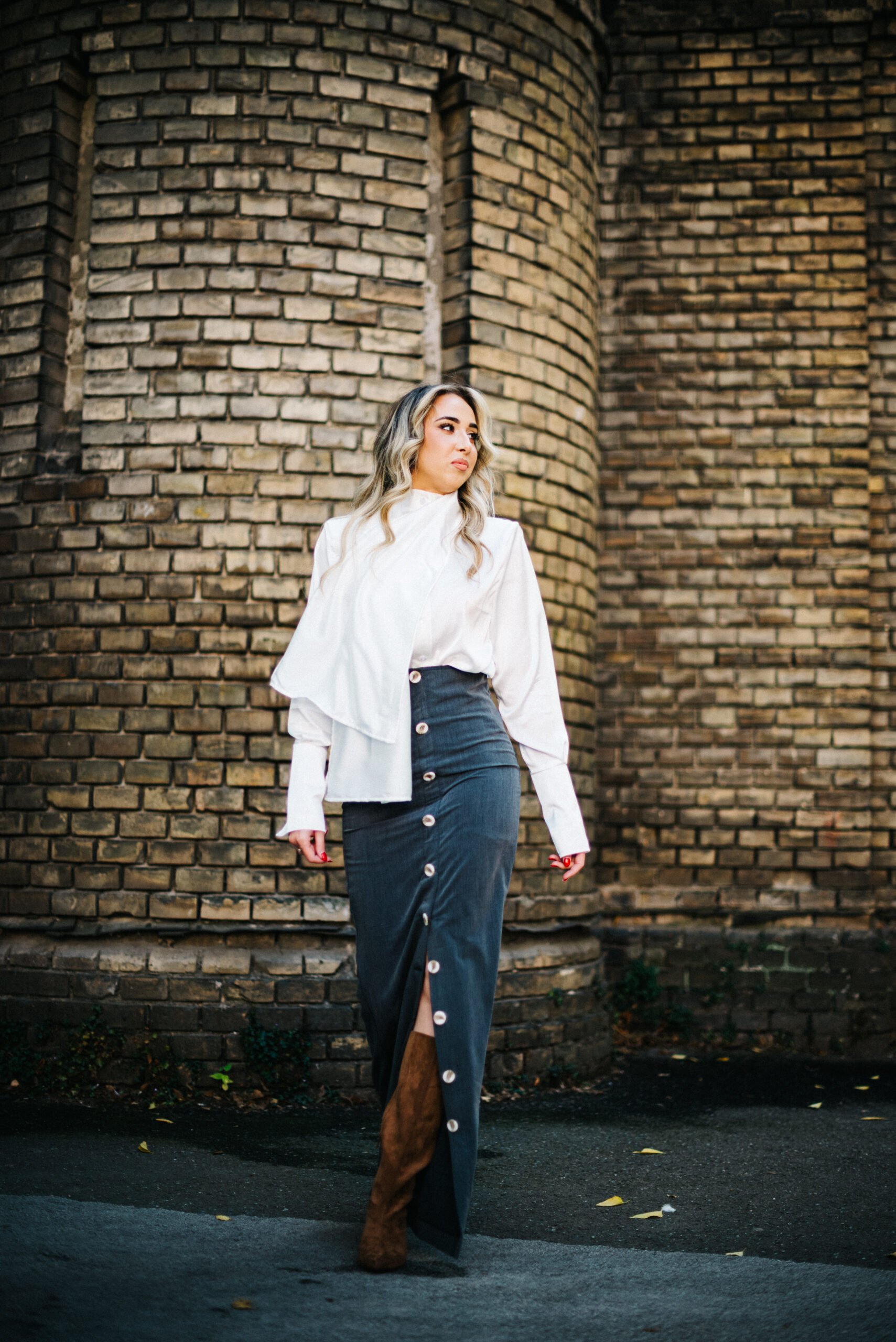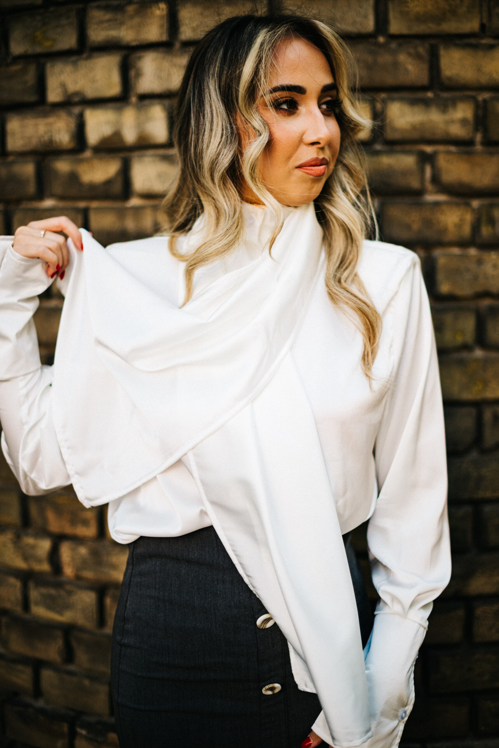 Košulja dolazi sa šalom izrađenim od istog materijala koji dodaje zanimljiv vizuelni akcenat.